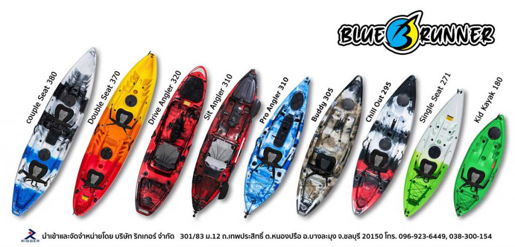โดยเรือคายัคในค่าย BLUERUNNER มีมากมายหลากหลายแบบ เริ่มตั้งแต่ เรือคายัค1ที่นั่ง, เรือคายัค2ที่นั่ง, เรือคายัคพายเล่น, เรือคายัคตกปลา, เรือคายัคล่องแก่ง, เรือคายัคทัวร์ริ่ง, คายัคใส, เรือคายัคสำหรับเด็ก มีสีสันให้เลือกมากมายกว่า 10 สี ไม่ว่าคุณจะต้องการพายเรือคายัคด้วยจุดประสงค์อะไร เราการันตีว่าเรามีเรือคายัคพร้อมเสริฟคุณอย่างแน่นอน